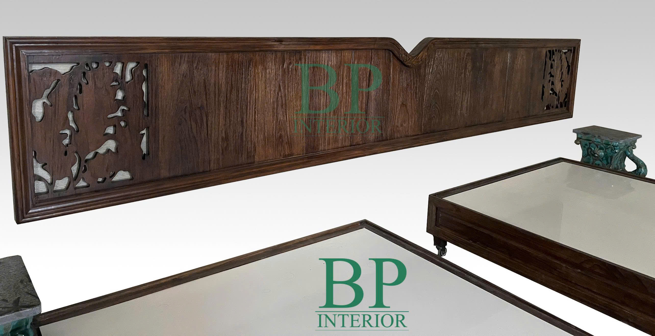 Đầu giường treo tường (Wall-mounted Headboard): Phần đầu giường dài được thiết kế treo cố định trên tường với các chi tiết CNC đục lỗ tinh xảo ở hai đầu, tạo điểm nhấn kiến trúc cho phòng ngủ.